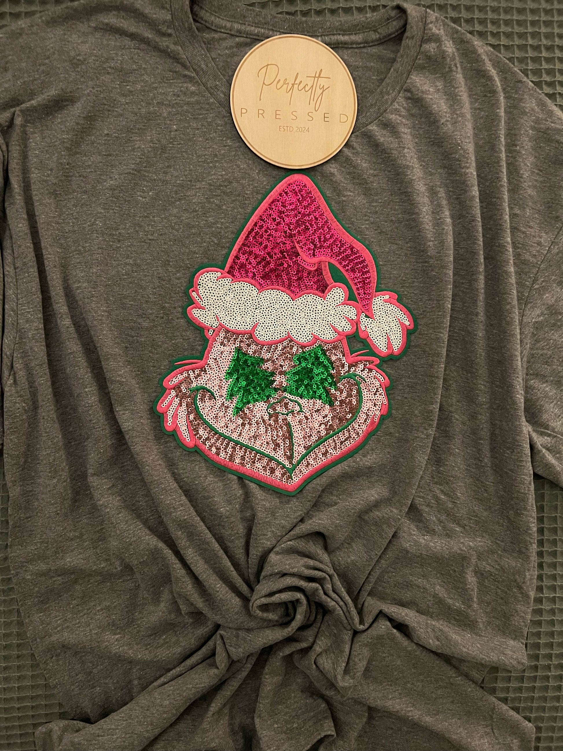 Mean One decal is iron on Sequin patch. If you need another color shirt, please email us at perfectlypressedky@gmail.com.
